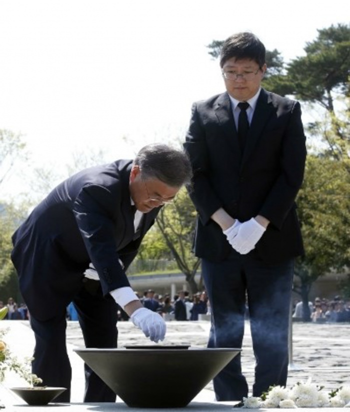 | △ 故 노무현 전 대통령 묘역 참배하는 문재인-김홍걸 |