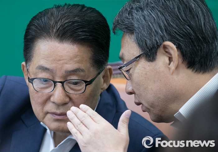 (서울=포커스뉴스) 박지원(왼쪽) 국민의당 원내대표가 4일 오전 서울 여의도 국회에서 열린 최고위원회의에 참석해 김성식 정책위의장과 대화하고 있다.