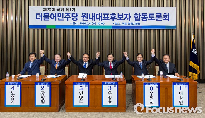 (서울=포커스뉴스) 4일 오전 서울 여의도 국회에서 열린 '원내대표 선거 합동 토론회'에서 후보들이 손을 맞잡고 사진촬영을 하고 있다. 왼쪽부터 노웅래 의원, 강창일 의원, 민병두 의원, 우상호 의원, 우원식 의원, 이상민 의원.