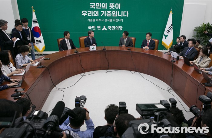 (서울=포커스뉴스) 새누리당 신임 원내지도부가 4일 오전 서울 여의도 국회에서 국민의당 지도부를 예방, 면담을 하고 있다. 오른쪽부터 김광림 새누리당 신임 정책위의장, 정진석 신임 원내대표, 안철수 국민의당 상임공동대표, 천정배 공동대표.