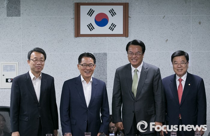 (서울=포커스뉴스) 새누리당 신임 원내지도부가 4일 오전 서울 여의도 국회 의원회관에서 국민의당 원내지도부를 예방, 취재진을 향해 포즈를 취하고 있다. 오른쪽부터 김광림 새누리당 신임 정책위의장, 정진석 신임 원내대표, 박지원 국민의당 원내대표, 김성식 정책위의장.