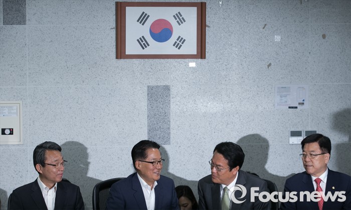(서울=포커스뉴스) 새누리당 신임 원내지도부가 4일 오전 서울 여의도 국회 의원회관에서 국민의당 원내지도부를 예방, 면담을 하고 있다. 오른쪽부터 김광림 새누리당 신임 정책위의장, 정진석 신임 원내대표, 박지원 국민의당 원내대표, 김성식 정책위의장.