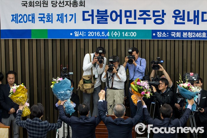 (서울=포커스뉴스) 우상호(왼쪽 두 번째) 더불어민주당 의원이 4일 오후 서울 여의도 국회에서 열린 원내대표선거에서 신임 원내대표로 선출된 뒤 취재진을 향해 포즈를 취하고 있다.
