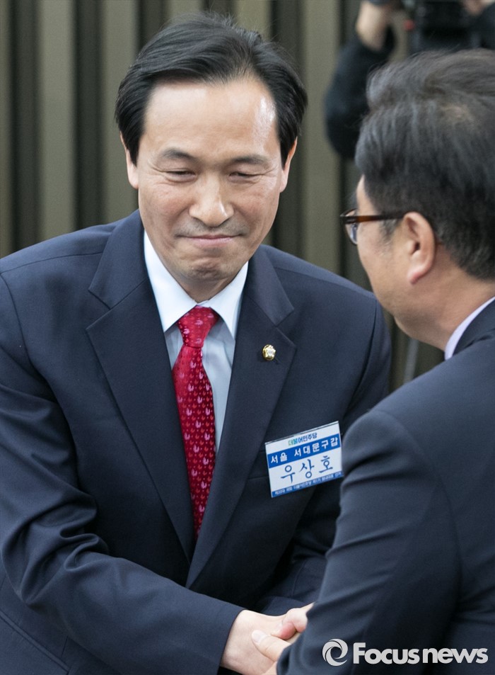 (서울=포커스뉴스) 4일 오후 서울 여의도 국회에서 열린 더불어민주당 20대 국회 1기 원내대표 선출을 위한 당선자 총회에서 선출된 우상호(왼쪽) 신임 원내대표가 경쟁 후보였던 우원식 의원의 축하를 받고 있다.