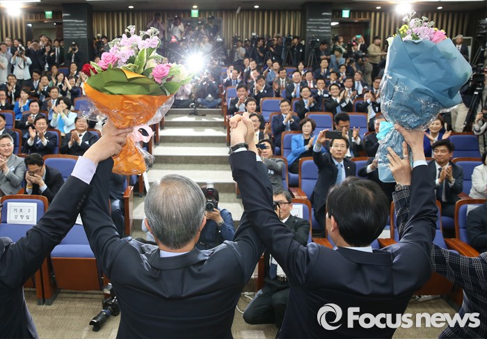 (서울=포커스뉴스) 4일 오후 서울 여의도 국회에서 더불어민주당 20대 국회 1기 원내대표 선출을 위한 당선자 총회에 참석한 김종인(왼쪽) 비대위 대표와 우상호 신임 원내대표가 취재진을 향해 포즈를 취하고 있다.