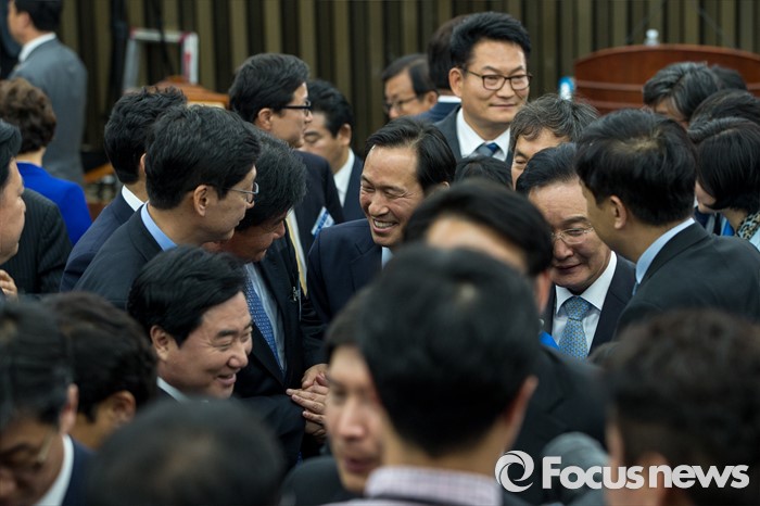 (서울=포커스뉴스) 우상호 더불어민주당 의원이 4일 오후 서울 여의도 국회에서 열린 원내대표선거에서 신임 원내대표로 선출된 뒤 동료 의원들에게 축하 받고 있다.