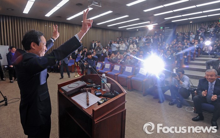 (서울=포커스뉴스) 4일 오후 서울 여의도 국회에서 더불어민주당 20대 국회 1기 원내대표 선출을 위한 당선자 총회에서 선출된 우상호 신임 원내대표가 소감을 전한 뒤 손을 들어 인사하고 있다.