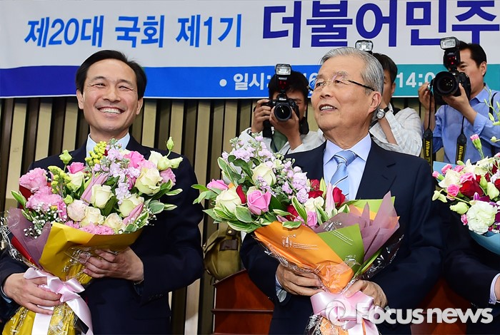 (서울=포커스뉴스) 4일 오후 서울 여의도 국회에서 더불어민주당 20대 국회 1기 원내대표 선출을 위한 당선자 총회에 참석한 김종인(오른쪽) 비대위 대표와 우상호 신임 원내대표가 취재진을 향해 포즈를 취하고 있다.