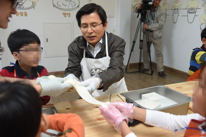 (세종=포커스뉴스) 황교안 국무총리가 어린이날을 하루 앞둔 4일 오후 세종시 연서면 세종 꿈의목장을 방문, 어린이들과 치즈 만들기 체험을 하고 있다. <사진제공=국무총리실>