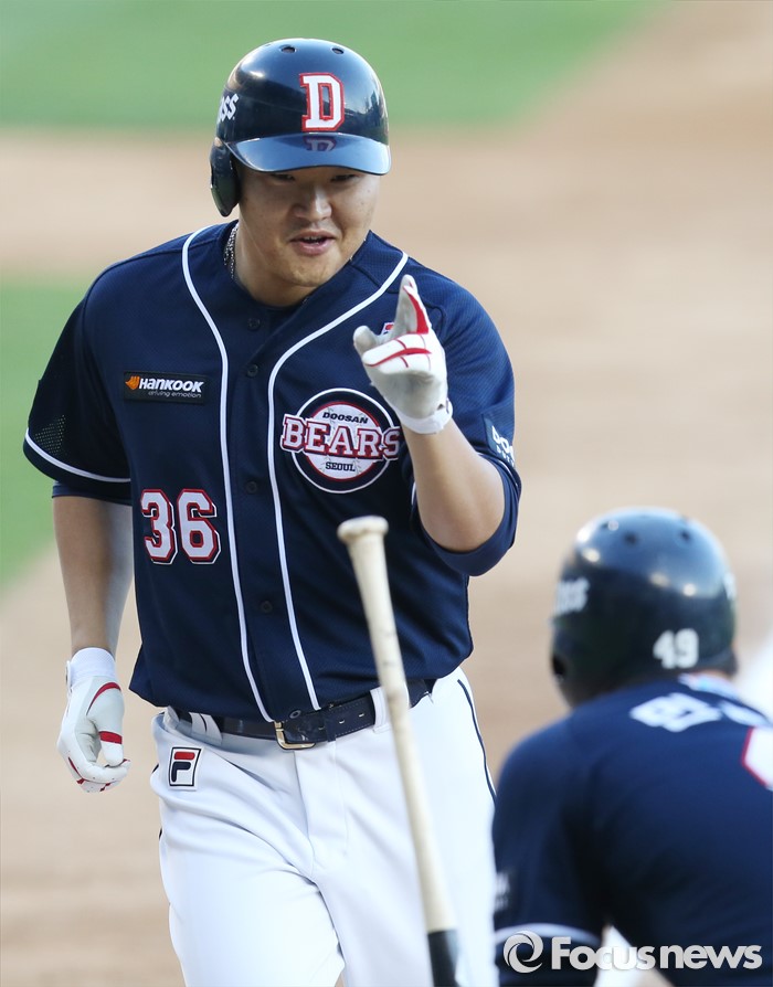(서울=포커스뉴스) 4일 서울 잠실구장에서 열린 2016 프로야구 두산-LG 경기 1회초 2사 1루에서 두산 오재일이 우월 2점 홈런을 치고 민병헌의 환영을 받으며 홈인하고 있다.