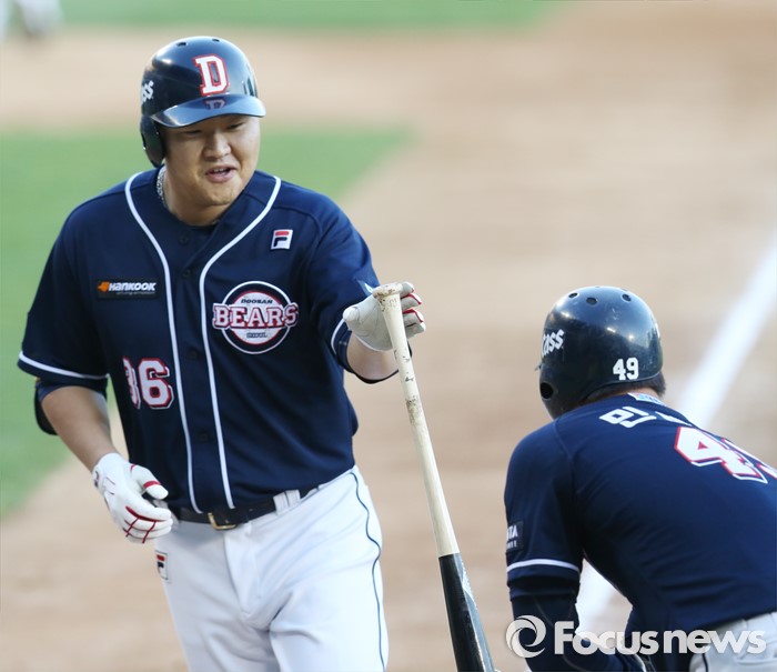 | △ 홈런타자 오재일 영접하는 민병헌 |