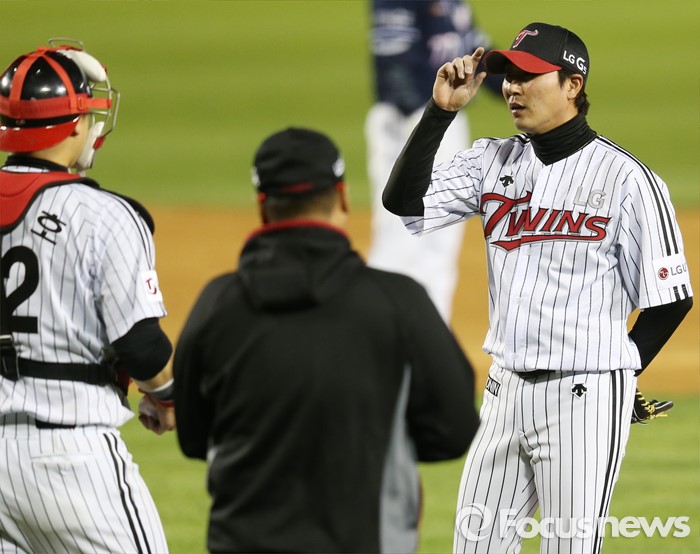 (서울=포커스뉴스) 4일 서울 잠실구장에서 열린 2016 프로야구 두산-LG 경기 5회초 무사 2루에서 LG 강상수 코치가 선발 투수 우규민의 교체를 위해 마운드에 올라가고 있다.