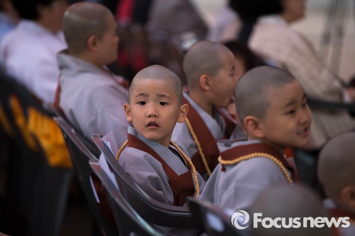 (서울=포커스뉴스) 4일 오후 서울 종로구 조계사에서 열린 연등 점등식 행사장에 동자승들이 참석해 있다.