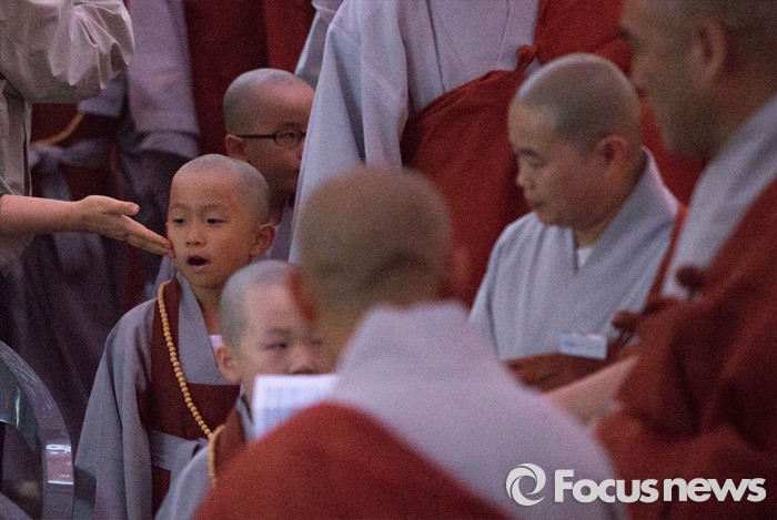 (서울=포커스뉴스) 4일 오후 서울 종로구 조계사에서 열린 연등 점등식 행사장에 동자승들이 참석하고 있다.