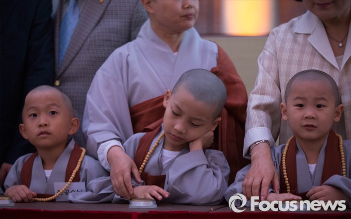 (서울=포커스뉴스) 4일 오후 서울 종로구 조계사에서 열린 연등 점등식에 참석한 한 동자승이 점등식 직전 졸음을 참지 못해 졸고 있다.