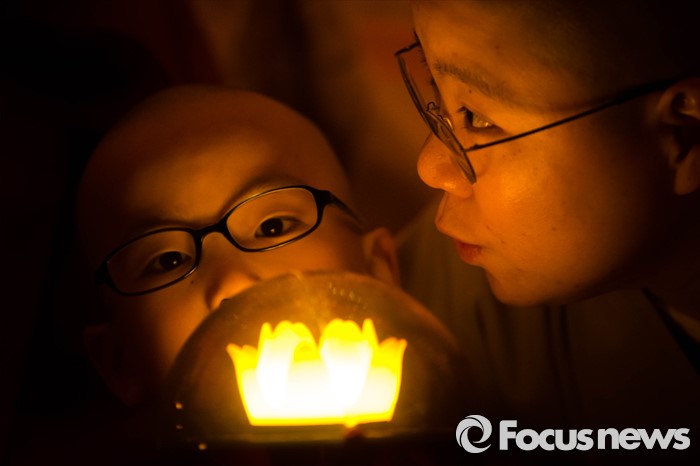 (서울=포커스뉴스) 4일 오후 서울 종로구 조계사에서 열린 연등 점등식에서 한 스님이 동자승에게 속삭이고 있다.