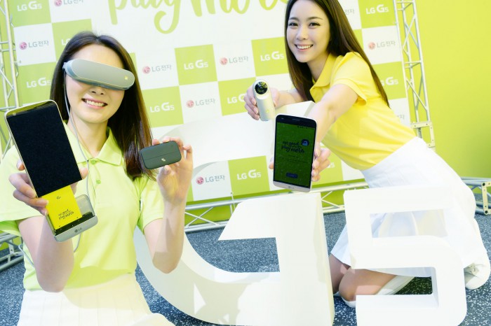 한편 G5는 세계 최초로 모듈(조립식) 디자인을 도입해 호평을 받고 있다. LG전자가 처음 선보인 조립식 스마트폰은 하단 부분을 서랍처럼 빼고 카메라·오디오 등 주변기기를 바꿔가며 장착해 쓰는 방식이다.3월 24일 서울 신사동 가로수길에 마련한 제품 체험존 'LG 플레이그라운드@가로수길'에서 LG전자 모델들이 'LG G5와 프렌즈'를들고 포즈를 취하고 있다. <사진제공=LG전자>