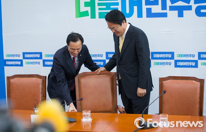 (서울=포커스뉴스) 정진석(오른쪽) 새누리당 신임 원내대표가 5일 오전 서울 여의도 국회 더불어민주당 원내대표실을 예방하자 우상호 더불어민주당 원내대표가 정 원내대표의 자리를 만들어주고 있다.