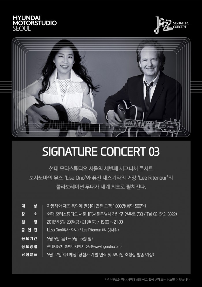 (서울=포커스뉴스) 현대자동차는 오는 20일부터 21일 서울 강남구의 브랜드 체험관 현대 모터스튜디오 서울에서 세 번째 시그니처 콘서트 ’리사 오노 &리 릿나워(Lisa Ono & Lee Ritenour)’를 개최한다고 6일 밝혔다.