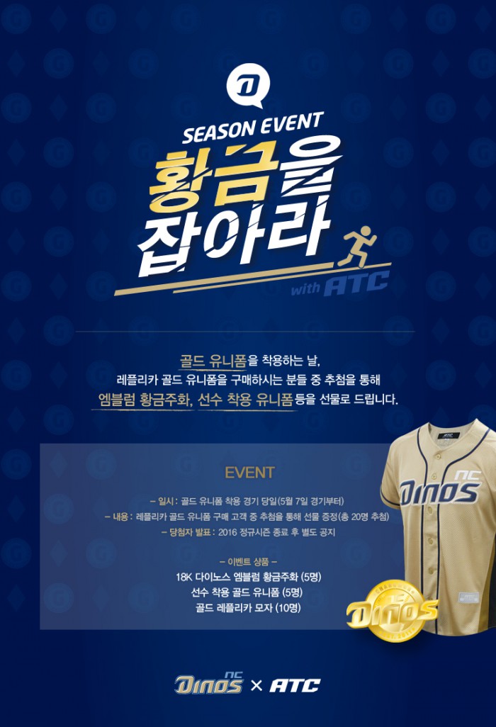 NC가 올시즌 주말 홈경기마다 실시하는 '황금을 잡아라' 이벤트는 레플리카 골드 유니폼을 구입하는 팬들에게 추첨을 통해 다이노스 엠블럼 황금주화를 선물하는 행사다. 온라인숍에서 구입할 경우 자동 응모된다. 오프라인 NC 다이노스 팬샵에서 구입하면 응모권을 받아 작성해야 한다.