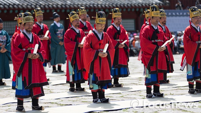 (서울=포커스뉴스) 7일 오후 서울 종묘 정전에서 열린 '조선의 세자빈 혼례를 고하다' 행사에서 참가자들이 묘현례를 재현하고 있다. 묘현례는 왕비나 세자빈이 왕실 혼례를 마친 후 조선왕조 역대 왕가 왕비의 신주가 모셔진 종묘를 알현하는 의례로서 조선시대 종묘에서 행해지는 국가의례 중 왕실 여성이 참여하는 유일한 행사이다.