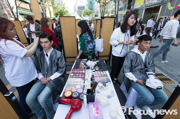 (서울=포커스뉴스) 7일 오후 서울 서대문구 신촌 차없는 거리에서 열린 제1회 신촌 뷰티 페스티벌 '뷰티체어 101' 행사 참가자들이 메이크업과 머리 손질을 받고 있다.