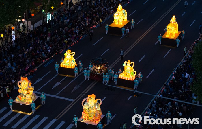 (서울=포커스뉴스) 부처님 오신날을 일주일 앞둔 7일 오후 서울 종로구 흥인지문부터 시작해 조계사까지 이어지는 화려한 연등 행렬이 펼쳐지고 있다.