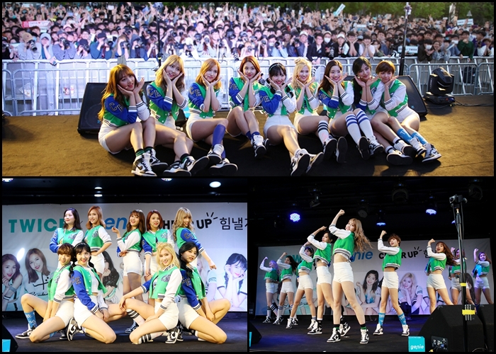 한편 이번 게릴라 콘서트는 '치어 업' 컴백을 기념해 팬들과 만난다는 취지로 기획됐다. 4월25일 컴백 후 음원사이트 1위 올킬, 뮤직비디오 유튜브 조회수 2000만뷰 돌파, 2016년 걸그룹 첫주 음반 판매량 1위를 비롯해 '엠카운트다운', '뮤직뱅크' 등 음악 방송 정상에 오르는데 누구보다 큰 힘이 되어 준 팬들에게 고마움을 전달하는 자리로 마련됐다.걸그룹 트와이스가 지난 7일 오후 6시30분 서울 마포구 상암동 SBS 프리즘센터 앞에서 음악 사이트 지니와 함께 하는 컴백 기념 게릴라 콘서트를 열었다.<사진제공=JYP엔터테인먼트>