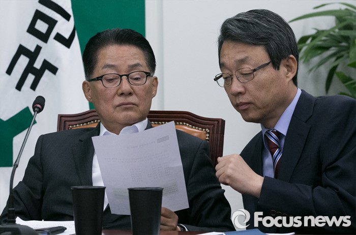 (서울=포커스뉴스) 박지원(왼쪽) 국민의당 원내대표와 김성식 정책위의장이 9일 오전 서울 여의도 국회에서 열린 최고위원회의에 참석해 대화하고 있다.