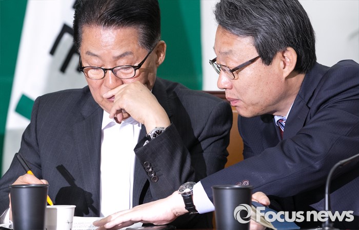 (서울=포커스뉴스) 박지원(왼쪽) 국민의당 원내대표와 김성식 정책위의장이 9일 오전 서울 여의도 국회에서 열린 최고위원회의에 참석해 대화하고 있다.