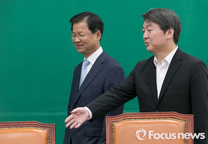 (서울=포커스뉴스) 안철수(오른쪽) 국민의당 상임공동대표와 천정배 공동대표가 9일 오전 서울 여의도 국회에서 열린 최고위원회의에 참석하고 있다.