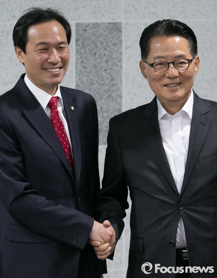 (서울=포커스뉴스) 우상호(왼쪽) 더불어민주당 원내대표가 9일 오전 서울 여의도 국회 의원회관에서 박지원 국민의당 원내대표를 예방, 취재진을 향해 포즈를 취하고 있다.
