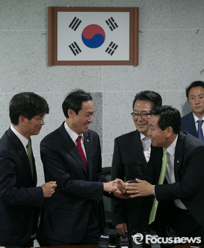 (서울=포커스뉴스) 우상호 더불어민주당 원내대표가 9일 오전 서울 여의도 국회 의원회관에서 박지원 국민의당 원내대표를 예방, 참석자들이 인사하고 있다. 왼쪽부터 박완주 더불어민주당 원내수석부대표, 우상호 원내대표, 박지원 국민의당 원내대표, 김관영 원내수석부대표.