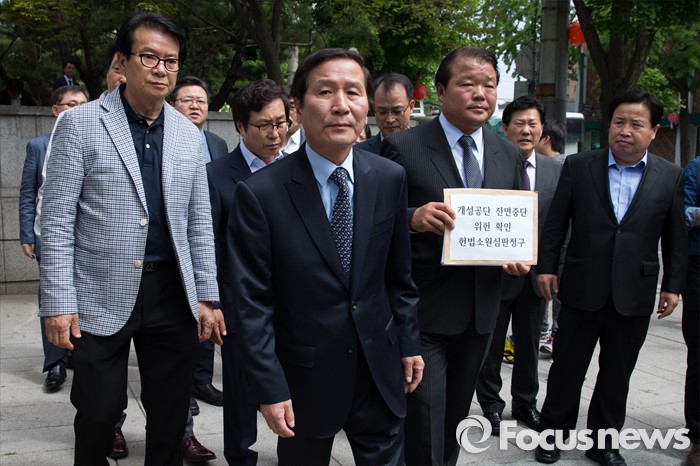 (서울=포커스뉴스) 9일 오전 서울 종로구 헌법재판소 앞에서 정기섭 개성공단기업협회 회장과 개성공단 비상대책위원회 관계자들이 정부의 개성공단 전면중단 조치에 대한 위헌심판 청구서 제출을 위해 민원실로 향하고 있다.