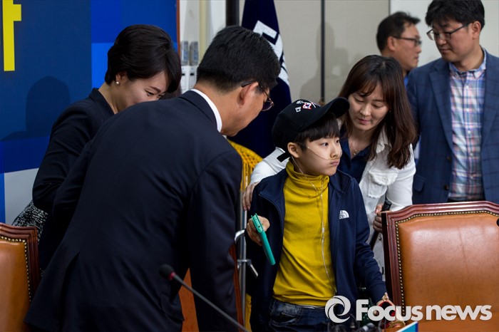 (서울=포커스뉴스) 양승조(왼쪽) 더불어민주당 가습기살균제대책특위 위원장과 이언주(왼쪽 두 번째) 간사가 9일 오전 서울 여의도 국회에서 열린 '가습기살균제 대책특위 1차회의'에 참석한 살균제 피해자 및 가족들과 인사 하고 있다.