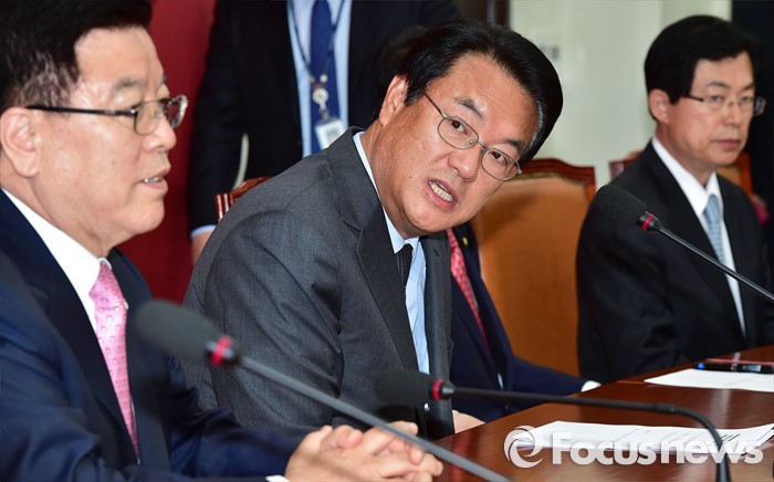 (서울=포커스뉴스) 정진석(왼쪽 두번째) 새누리당 원내대표가 9일 오전 서울 여의도 국회에서 열린 신임 원내대표단과의 티타임에 참석해 모두발언을 하고 있다.