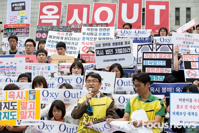 (서울=포커스뉴스) 9일 오후 서울 종로구 세종문화회관 앞 계단에서 환경운동연합 및 시민사회단체들이 옥시 불매 집중 행동 돌입선언 기자회견을 하고 있다.