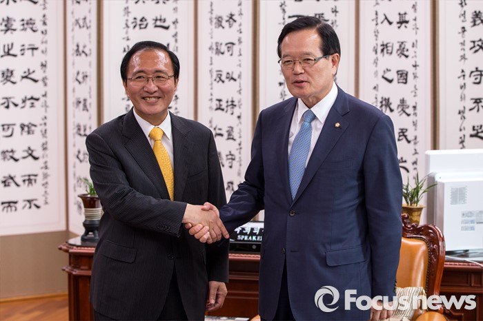 (서울=포커스뉴스) 정의화(오른쪽) 국회의장이 9일 오후 서울 여의도 국회에서 노회찬 정의당 원내대표와 면담에 앞서 악수 하고 있다.