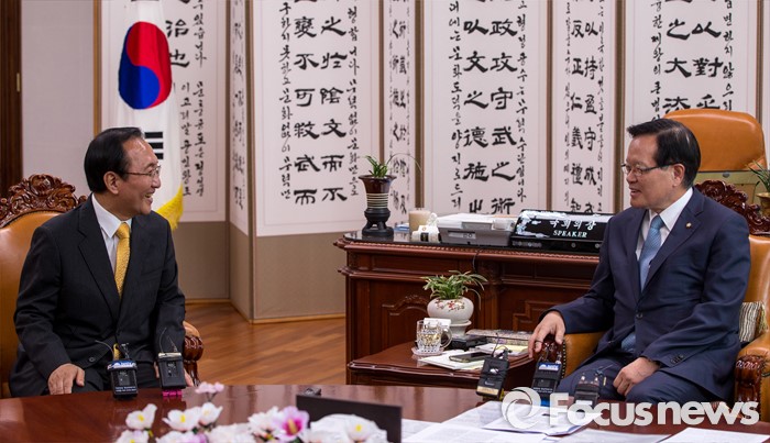 (서울=포커스뉴스) 노회찬(왼쪽) 정의당 원내대표가 9일 오후 서울 여의도 국회에서 정의화 국회의장을 예방 하고 있다.
