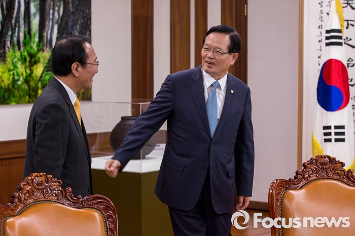 (서울=포커스뉴스) 정의화(오른쪽) 국회의장이 9일 오후 서울 여의도 국회에서 노회찬 정의당 원내대표와 면담을 하기 위해 자리로 향하고 있다.