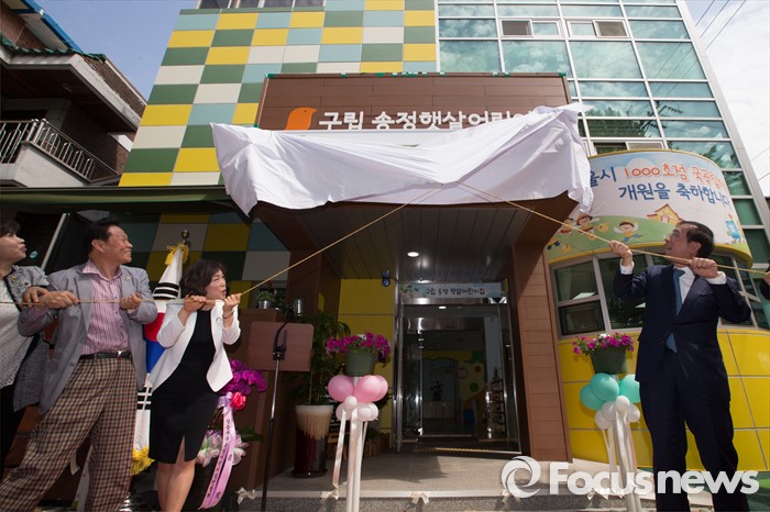 (서울=포커스뉴스) 9일 오후 서울 성동구 송정햇살어린이집에서 열린 서울시 1000번째 국공립어린이집 개원식에 박원순(오른쪽) 서울시장과 참석내빈들이제막식을 하고 있다.