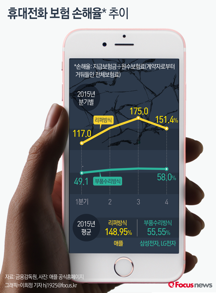 (서울=포커스뉴스) 9일 금감원이 집계한 휴대전화 수리 방식별 보험 손해율을 보면 2015년 기준 리퍼 방식의 보험료 평균 손해율은 148.95%였고, 부품수리방식의 보험료 평균 손해율은 55.55%다.