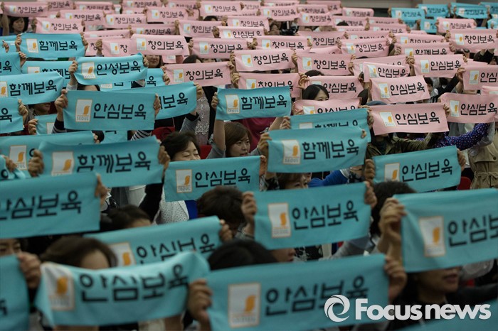 (서울=포커스뉴스) 9일 오후 서울 송파구 아이코리아에서 열린 '보육교직원 결의대회'에 참석한 보육관계자들이 발대식 세리머니를 하고 있다.