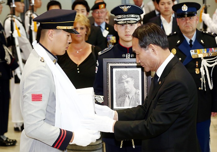(서울=포커스뉴스) 박승춘 국가보훈처장이 9일 오후 인천국제공항에 도착한 6.25전쟁 네덜란드 참전용사 故 니콜라스 프란스 웨셀(Nicolas Frans Wessels)씨의 유해에 양국 국기가 새겨진 감사와 경의의 증표를 전달하고 있다. 6·25전쟁에 네덜란드 반호이츠 부대원(일병)으로 참전한 故 니콜라스 프란스 웨셀씨는 1953년 11월에 한국을 떠났지만 자신이 목숨바쳐 지켰던 한국에 대한 애정이 아주 컸으며, 평소 부산 UN기념공원에 묻힌 전우들을 그리워하다 지난해 4월 7일 "한국에 있는 전우들 곁에 잠들게 해 달라"는 유언을 남긴 채 향년 84세의 일기로 삶을 마감했다. 지난해 5월 부산 UN기념공원에 프랑스 참전용사 故 레몽 베나르씨가 사후 안장 실시된 이후 4번째인 웨셀 씨는 오는 12일 오전 부산UN기념공원에 안장된다. <사진제공=국가보훈처>