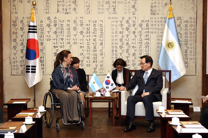 (서울=포커스뉴스) 정의화(오른쪽) 국회의장이 9일 오전 서울 여의도 국회 의장접견실에서 가브리엘라 미체띠(Gabriela MICHETTI) 아르헨티나 부통령 겸 상원의장을 접견, 양국관계 발전 및 상호협력 방안에 대해 논의하고 있다. <사진제공=국회>