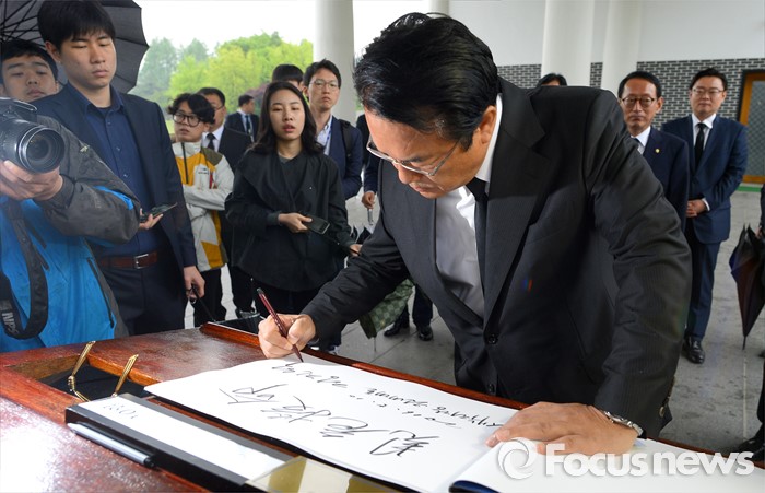 (서울=포커스뉴스) 10일 오전 서울 동작구 국립현충원을 찾은 정진석 새누리당 신임 원내대표가 참배 후 방명록을 작성하고 있다.