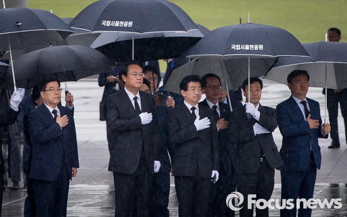 (서울=포커스뉴스) 10일 오전 서울 동작구 국립현충원을 찾은 정진석 새누리당 신임 원내대표와 김광림 신임 정책위의장이 국민의례를 하고 있다.