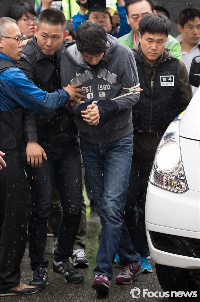 (인천=포커스뉴스) 안산 대부도 토막살인의 용의자 조성호가 10일 오전 인천 연수구 연수동의 주거지에서 현장검증을 위해 범행현장으로 이동하고 있다.