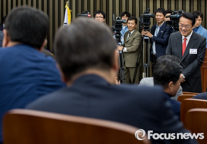 (서울=포커스뉴스) 10일 오전 서울 여의도 국회에서 열린 새누리당 제20대 국회 초선의원 연찬회에 참석한 정진석 신임 원내대표가 초선의원들과 인사하고 있다.