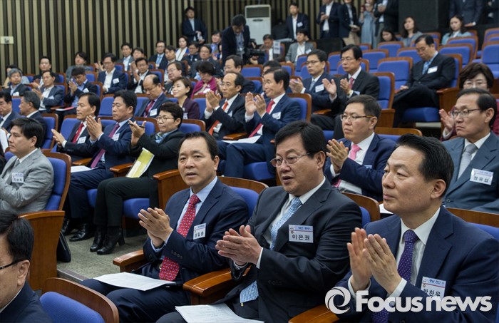 (서울=포커스뉴스) 10일 오전 서울 여의도 국회에서 열린 새누리당 제20대 국회 초선의원 연찬회에 참석한 초선의원들이 박수치고 있다.